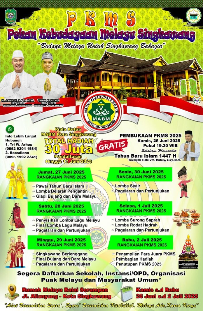 Singkawang, MC – Dalam rangka menyambut Tahun Baru Islam 1 Muharram 1447 Hijriah, Dewan Pengurus Daerah (DPD) Majelis Adat Budaya Melayu (MABM) Kota Singkawang akan menggelar Pekan Kebudayaan Melayu Singkawang (PKMS).